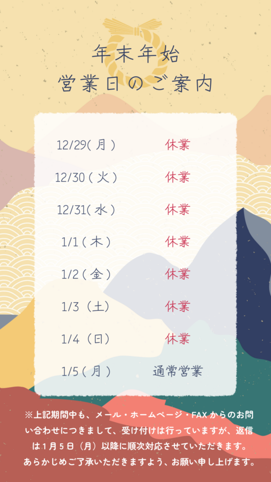 ※上記期間中も、メール・ホームページ・FAXからのお問い合わせにつきまして、受け付けは行っていますが、返信は1月5日(月)以降に順次対応させていただきます。